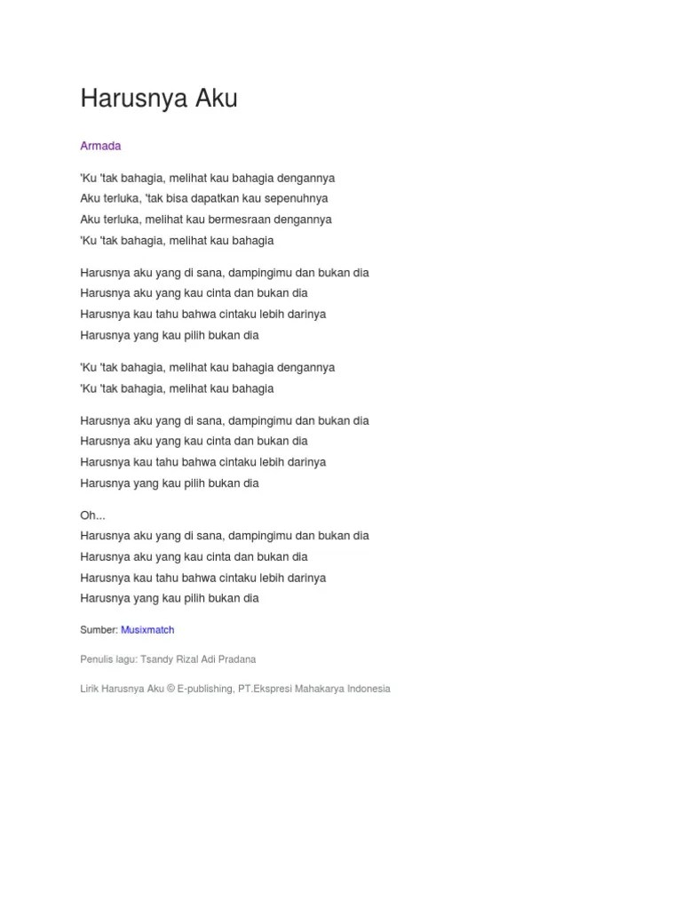Harusnya kau tahu bahwa cintaku lebih darinya. Net tak pernahkah kau sadari akulah yang kau sakiti engkau pergi dengan janjimu yang telah kau ingkari oh. Harusnya yang kau pilih bukan dia. Kunci gitar armada dengan lirik ku tak bahagia melihat kau bahagia berjudul harusnya aku masih sering didengarkan di youtube maupun . Aku terluka melihat kau bermesraan dengannya. Luka dihatimu tak lagi berasa pilu. Harusnya aku yang di sana, dampingimu dan bukan dia. Harusnya yang kau pilih bukan dia. Harusnya kau tahu bahwa cintaku lebih darinya. Ku tak bahagia, melihat kau bahagia. Lirik lagu terry harusnya kau pilih aku lyrics. Harusnya aku yang di sana, dampingimu dan bukan dia. Harusnya aku yang kau cinta dan bukan dia.